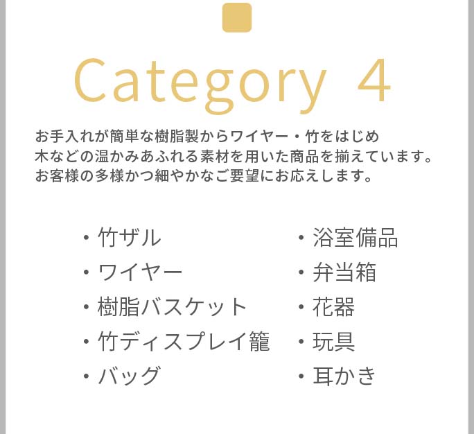 天然素材を使った手仕事の品々から用途に合わせた新素材までお客様のニーズに合った商品総合カタログができました 全190ページのカタログは4つのカテゴリーで構成しており上部のバナー又は下記カテゴリーをクリックするとWEB版をご覧いただけます