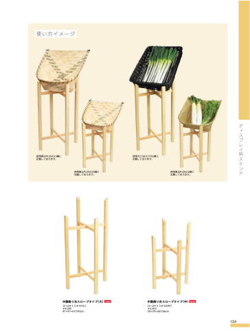 使い方イメージ 使用箕はP125の19番に 記載しております。 使用カゴはP137の2番に 記載しております。 使用箕はP125の20番に 記載しております。 使用箕はP126の2番に 記載しております。 ディスプレイ用スタンド 木製飾り台スロープタイプ(大) NEW 13-124-1[15-633L] ¥8,000 47×47×H77/90cm 木製飾り台スロープタイプ(中) NEW 13-124-2[15-633M] ¥6,500 39×39×H57/66cm 124
