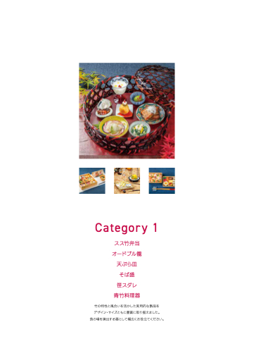 Category 1 スス竹弁当 オードブル籠 天ぷら皿 そば盛 笹スダレ 青竹料理器 竹の特性と風合いを活かした実用的な製品を デザイン・サイズともに豊富に取り揃えました。 食 の 場 を 演 出 す る 器 と し て 幅 広 く お 役 立 てく だ さ い 。